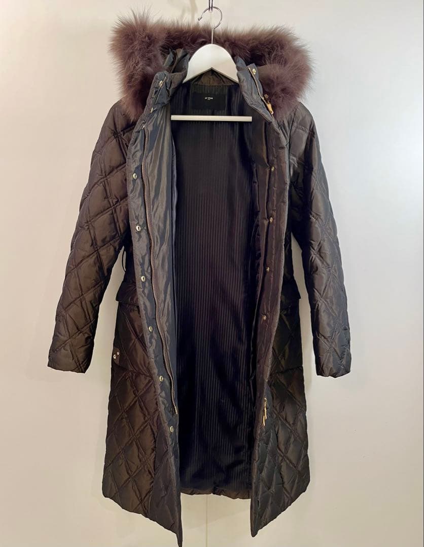 ダークブラウンのキルティングダウンジャケット、ファー付きフードとウエストベルトが特徴。