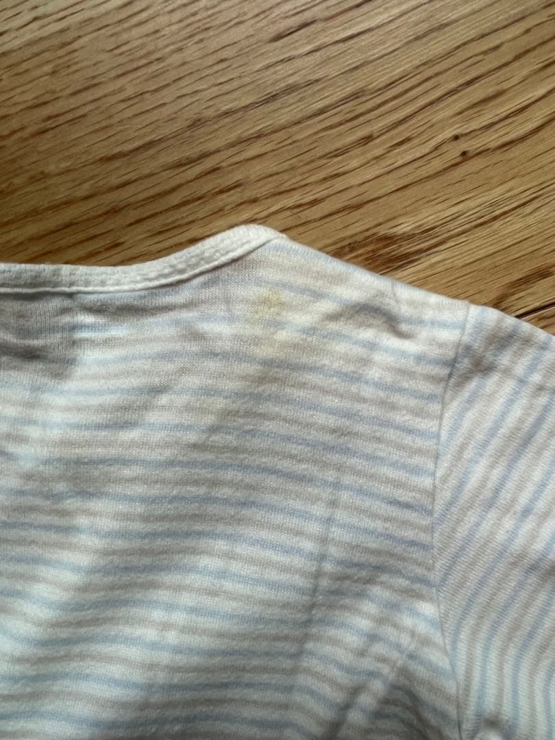 familiar ストライプとタオル無地のデザイン、刺繍ワッペン付きのロンパース。