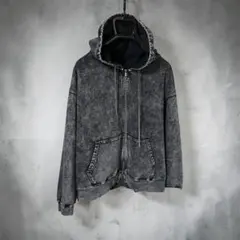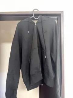 ダークグレーのジップアップパーカー、フード付きでフロントポケットあり。