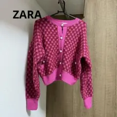 ピンクのニットカーディガン、ボタン付きで模様編みデザイン。