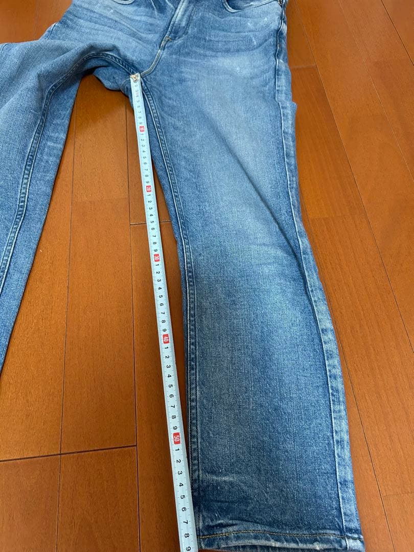 ライトブルーのストレートデニム、ハイウエストデザインでスタイリッシュ。