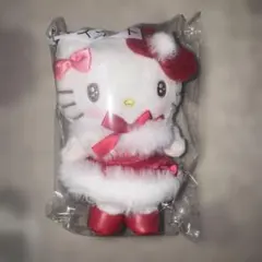 ハローキティの可愛らしいぬいぐるみ、リボンとファー付きのドレスが特徴。
