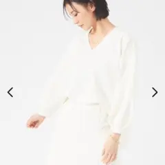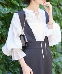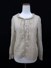 コットン素材のベージュ長袖シャツ、プリーツ入りの袖が特徴。