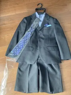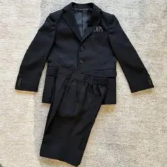 ネイビーのフォーマルスーツ、ジャケットとパンツ、ネクタイとポケットチーフ付き。