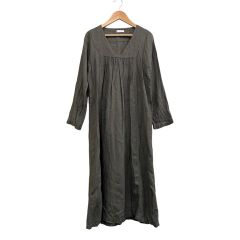 ネイビーのロングワンピース、チェック柄の襟元とサイドポケットが特徴。