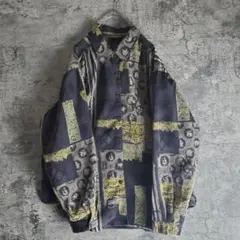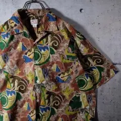 レトロ古着 総柄オープンカラーシャツ 長袖 アート柄 クレイジーパターン 茶色M