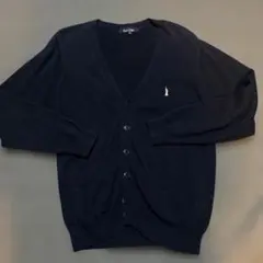 グレーのVネックカーディガン、フロントボタン式、リブ編みの袖口と裾、左胸にロゴ刺繍あり。