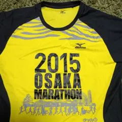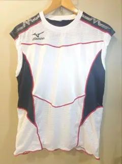 MizunoのXLサイズの青い陸上用シャツ、ロゴと文字のプリントデザイン。