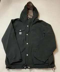 カーキとブラックの配色で、チェック柄の裏地が特徴的なマウンテンパーカー