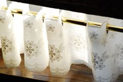 サックスの無地の薄手の綿生地(綿100%)で カフェカーテンを作りました。