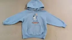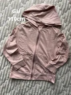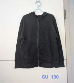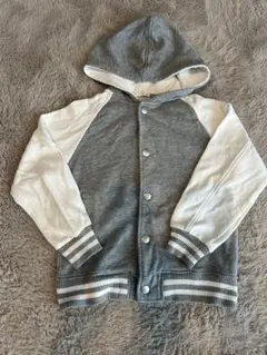 フード付きのグレーのパーカー、ポケット付きで便利です。