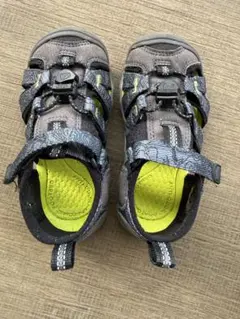 紫色のKEENサンダル、調整可能なストラップとトレッドソール付き。