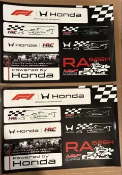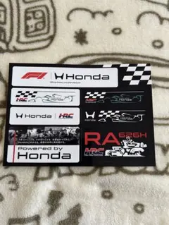 F1やHRCロゴがデザインされた多色のレース関連ステッカーセットとホンダの歴史を積んだ冊子です