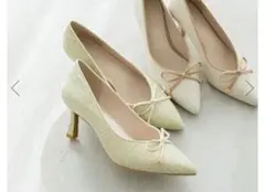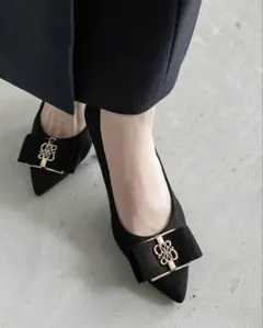 リボンと金具がアクセントのブラックポインテッドトゥパンプス。