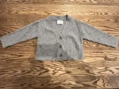 リブ編みのグレーのカーディガン、2つのボタン付きで、100cm以上のサイズに最適。
