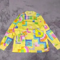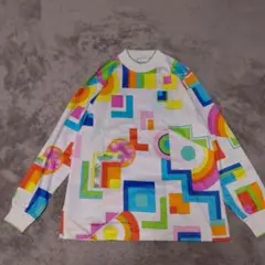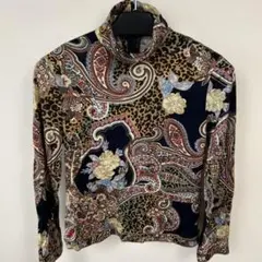 カラフルな花柄と幾何学模様のハイネック長袖トップス。