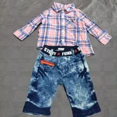 フリル付きの薄いピンクの長袖トップスとデニムミニスカートのセット。