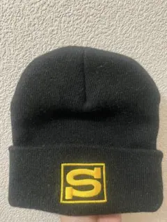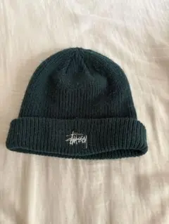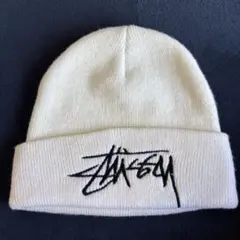 ベージュのStussyニット帽、ロゴ刺繍付きでスタイリッシュ。
