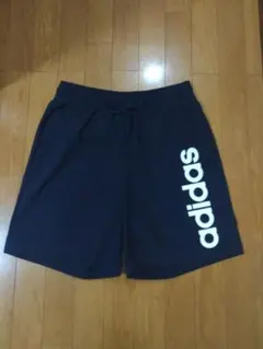 ネイビーのadidasショートパンツ、3本ラインデザインでスポーティな印象。