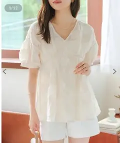 【神戸レタス】チェックオーガンジーペプラムブラウス ベージュ ギンガムチェック