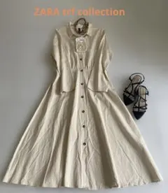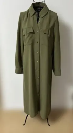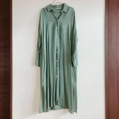 ダークグリーンの長袖シャツワンピース、プリーツデザインが特徴。