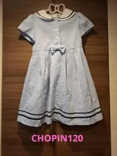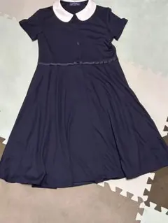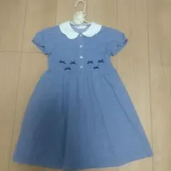 青い半袖ワンピース、襟付き、リボン刺繍付き。