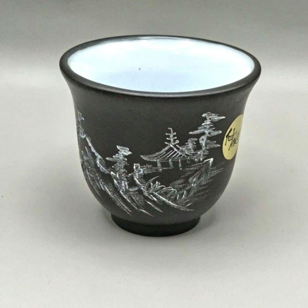 湯呑み5個セットです。黒色の陶器に白で景色が描かれた上品なデザインです。
