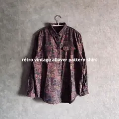 70s 80s オンワード 総柄 千鳥柄 長袖シャツ ブラウス レディース 9号 モノトーン 白黒 レトロ サイケ 昭和ビンテージ 古着 匿名配送