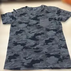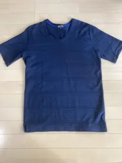 ネイビーのストライプデザインで、ポケット付きのカジュアルTシャツ。