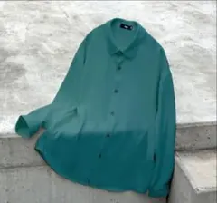 滑らかなダークグリーンの長袖シャツ、ボタン付きでシンプルなデザイン。