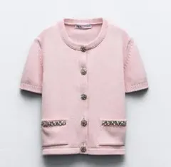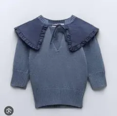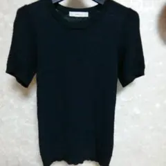 リブ編みデザインのライトブルー半袖ニット、フリル付きで女性らしい印象。
