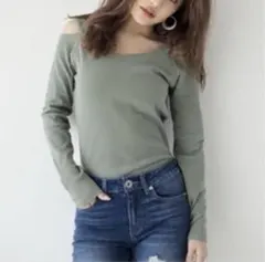 GRL 【M】 メロウトップス カットテレコリブボートネック フリル グレージュ