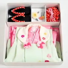 赤い花柄の子供用着物、髪飾り付きで七五三に最適。