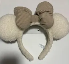 アイボリーのフリース風生地で作られたミッキーマウス型のカチューシャ、ディズニーランド・シーにぴったりのカジュアルなスタイル。