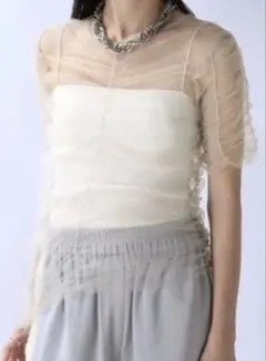 シアーレースデザインのホワイト半袖シャツカーディガン。