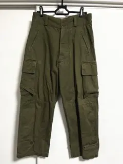 カーゴパンツの代名詞ともいえるデザインは60年代に採用されたアイテムながら、今見てもまったく古臭さを感じさせない名作となります。実物品は現在出回ることもほとんどない昨今、随所にこだわりを持って再現させていただきました。 元々は寒冷地帯での防寒用に作られており、下にもう一枚履けるよう太めのシルエットが特徴的。コットンとナイロンを混紡したサテン生地は実物を見本にオリジナルで製作させていただきました。部材やディテール、ヴィンテージ感のあるアルミのファスナーと、細部まで作り込んだ自信作となっています。