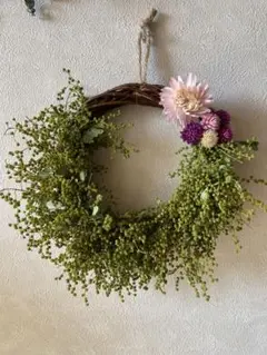 パールアカシア、千日紅、貝細工を合わせたナチュラルリースです。とてもかわいく仕上がりました。