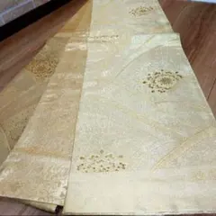やわらかな金彩の光沢が美しく広がる地に、流れるような波文様を織り出した格調高い正絹袋帯でございます。
