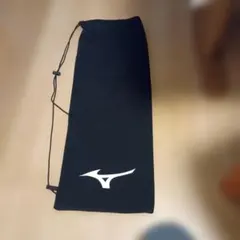 Mizunoの黒いドローストリングバッグ、ホワイトロゴ付き。