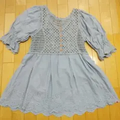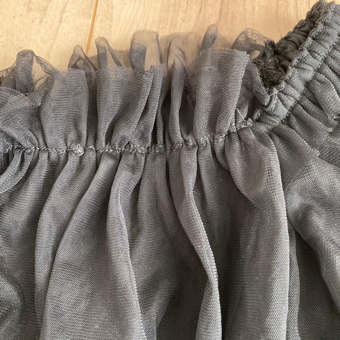 オフショルダーのシフォン素材のグレーのチュニック、裏地付きで快適な着心地。