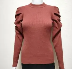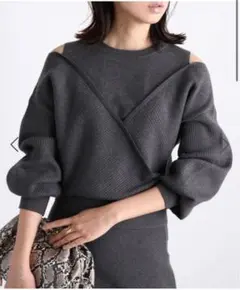 リブ編みの黒ニット、ファー付き袖で温かみのあるデザイン。