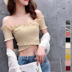 オフショルダー ニットトップス ボタン付き ノディテール ロングスリーブ