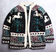 ポケットがついたニットカーディガンタイプとなり、ネイティブ柄のようなデザインにも目を引きます。