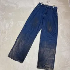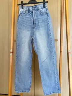 ダメージ加工が施されたライトブルーデニムパンツ。ストレートスタイルでカジュアルに最適。
