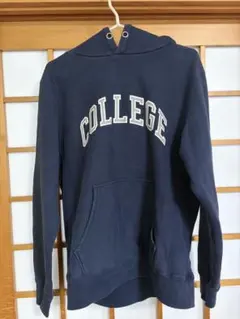 フロントにBEAMSのプリントが施されたネイビーのフード付きパーカー。