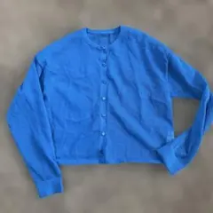リブ編みデザインのベージュカーディガン、ボタン留め、袖に小さな汚れあり。