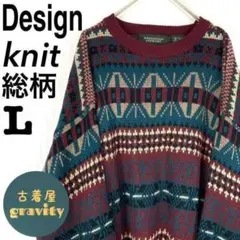 総柄セーター 刺繍 ニット L アート柄 3D 古着レトロ 派手柄 くるみボタン