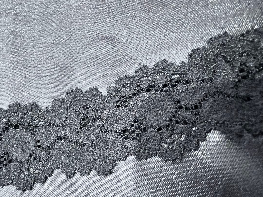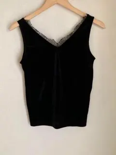 光沢感のあるブラックのレース付きキャミソール、調整可能なストラップ付き。