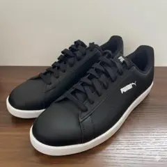 PUMAのホワイトとブラックのスニーカー、合成皮革製でスタイリッシュなデザイン。