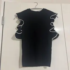 ジッパー付きのハイネックデザインの黒いノースリーブニット。
